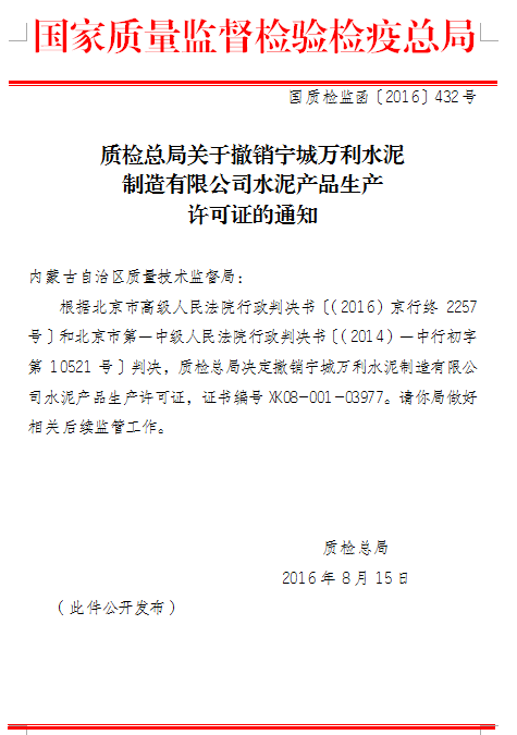 10月14日,質(zhì)檢總局官網(wǎng)發(fā)布通知稱,根據(jù)北京市高級(jí)人民法院行政判決書〔(2016)京行終2257號(hào)〕和北京市第一中級(jí)人民法院行政判決書〔(2014)一中行初字第10521號(hào)〕判決,質(zhì)檢總局決定撤銷寧城萬利水泥制造有限公司水泥產(chǎn)品生產(chǎn)許可證,證書編號(hào)XK08-001-03977。
