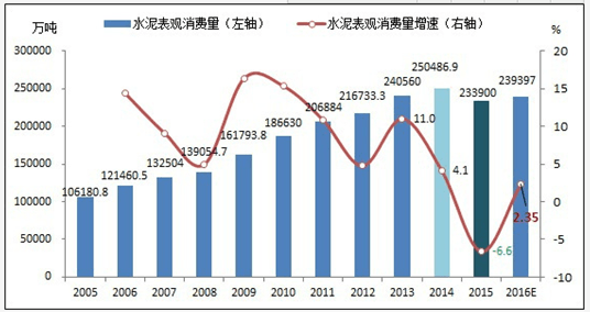 2016年全國水泥表觀消費(fèi)量及增速預(yù)估
