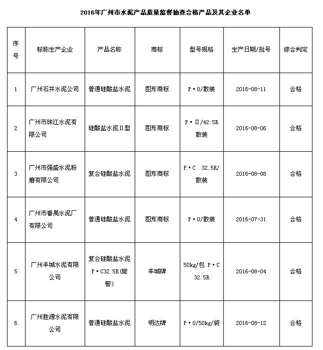 12月2日,廣州市質量技術監(jiān)督局官網公布2016年廣州市水泥產品質量監(jiān)督抽查結果,該局近期對本市生產領域水泥產品質量進行了監(jiān)督抽查,共抽查了6家企業(yè)生產的6批次產品,經檢驗全部符合標準要求。