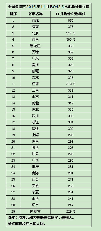 從榜中可以看出,西藏以850元/噸的均價(jià),位居榜首。從2016年上半年開(kāi)始,西藏水泥價(jià)格一路上漲,曾直逼1000元/噸大關(guān)。11月下旬開(kāi)始,水泥價(jià)格有所松動(dòng),對(duì)11月均價(jià)有所打壓,截止12月7日,西藏水泥價(jià)格832元/噸,目前仍呈小幅下降趨勢(shì)。