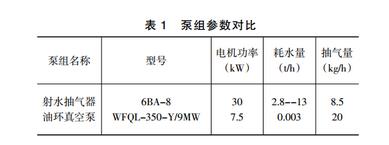 原射水抽汽系統(tǒng)動(dòng)力設(shè)備是兩臺(tái)射水泵電動(dòng)機(jī),一用一備。現(xiàn)在新安裝的油環(huán)真空泵組動(dòng)力設(shè)備是兩臺(tái)真空泵電動(dòng)機(jī),一用一備。所以節(jié)電效益就是兩種泵電動(dòng)機(jī)功率對(duì)比。參數(shù)對(duì)比見表1。