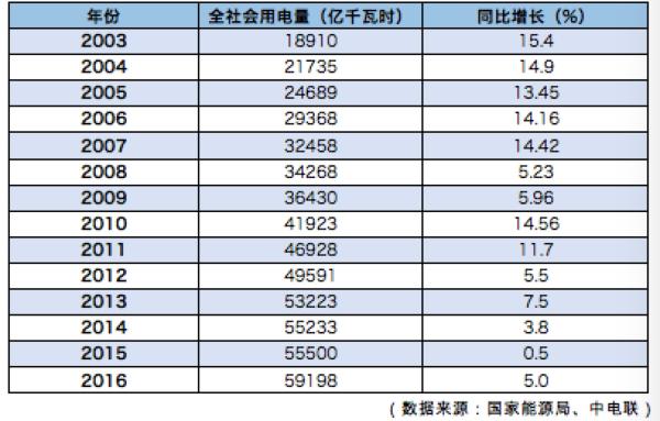 2003年-2016年中國全社會(huì)用電量