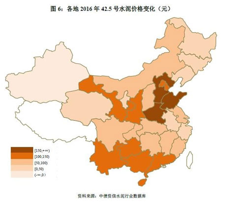 從各省2016年水泥價格變化方面看,河北水泥價格漲幅全國居首,達220元,山東、河南在四季度錯峰執(zhí)行后價格亦有明顯增長,整體看納入統(tǒng)計的30個地區(qū)中40%地區(qū)漲幅超過100元,33%地區(qū)水泥價格漲幅在50~100元區(qū)間,僅新疆水泥價格較2015年末有所下降。