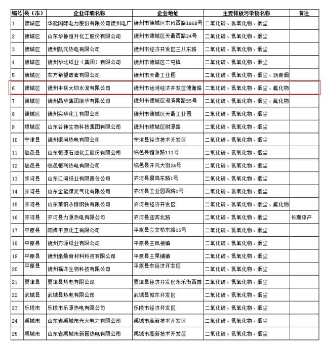 德州市2016年重點(diǎn)大氣污染源中包含一家水泥企業(yè)(德州中聯(lián)大壩水泥有限公司),2017年表中所涉及的企業(yè)可能會(huì)被被被重點(diǎn)監(jiān)控。