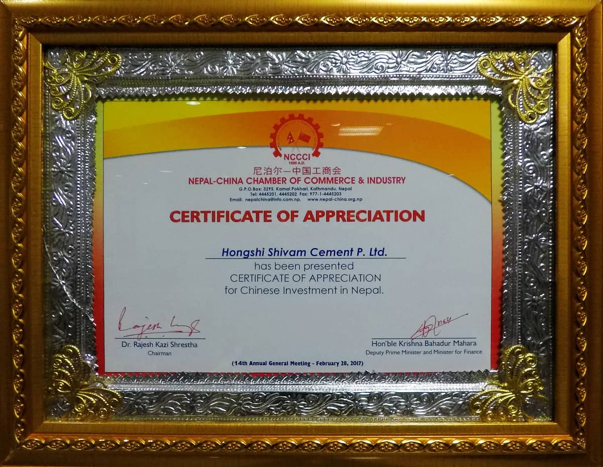 會上,尼中工商會向兩國貿(mào)易促進、旅游發(fā)展、投資開發(fā)三大領(lǐng)域的貢獻方頒發(fā)了榮譽獎。尼泊爾紅獅希望水泥公司獲得了投資開發(fā)領(lǐng)域的榮譽獎。