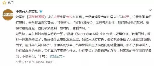 據(jù)中國(guó)商人雜志社消息:在《環(huán)球新聞眼》采訪樂天集團(tuán)會(huì)長(zhǎng)時(shí),當(dāng)記者問及當(dāng)前中國(guó)人抵制樂天,樂天集團(tuán)有何打算,他面露笑容說: