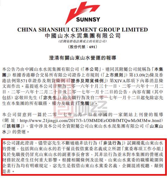 山水水泥(0691.HK)的“宮斗”大戲繼續(xù)發(fā)酵。山水水泥日前發(fā)布公告,指責(zé)山東山水前董事兼副董事長(zhǎng)宓敬田擾亂山東山水的營(yíng)運(yùn)。截圖如下: