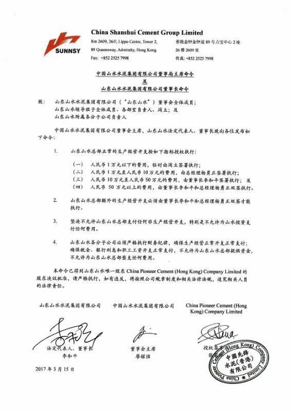 本命令已得到山東山水唯一股東China Pioneer Cement (Hong Kong) Company Limited的股東決議批準,請嚴格執(zhí)行,如有違反,將按照公司規(guī)章制度和相關(guān)法律法規(guī),追究相關(guān)人員的法律責任。