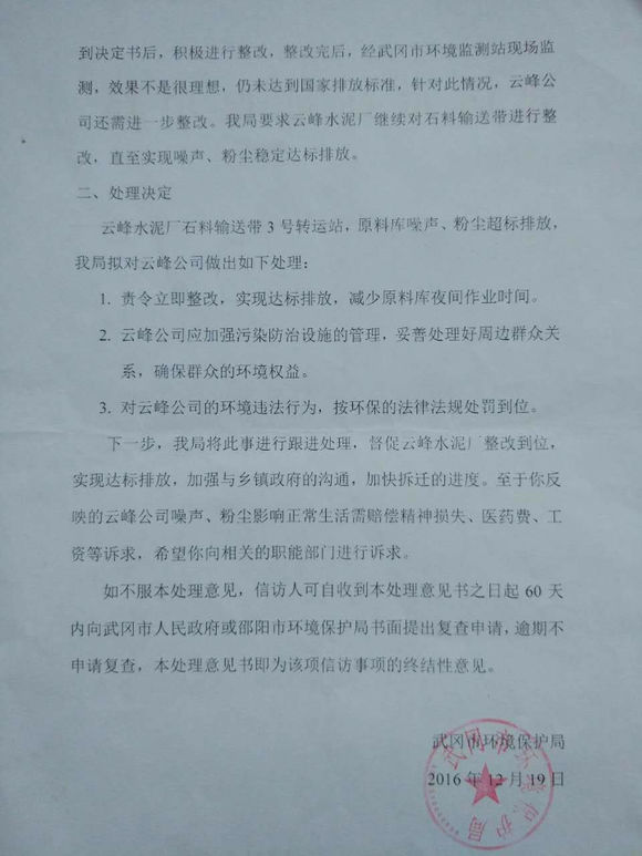 由于受武岡云峰水泥廠刺耳的噪聲和粉塵影響,我和我的家人心煩意亂、情緒緊張、頭昏腦脹,無法正常入睡,導(dǎo)致血壓升高,引發(fā)多種疾病,身體狀況不斷惡化。忍無可忍之下,我四處奔波,多次請求環(huán)保部門出面處理。2016年12月19日,武岡市環(huán)保局終于作出了《關(guān)于張先斌同志反映云峰水泥廠石料輸送帶、原料庫噪聲、粉塵影響正常生活的調(diào)查處理回復(fù)》(見圖三和圖四),承認(rèn)石料輸送帶、原料庫與我家約50米,且對我家的生活造成一定的影響;經(jīng)過整改,仍未達(dá)到國家的排放標(biāo)準(zhǔn)。為此,環(huán)保局做出了以下三個(gè)處理決定。然而,該處理決定問題太多,我們無法接受。