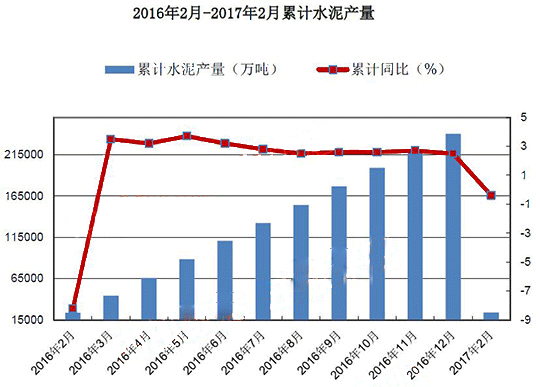 報告顯示,2017年1-2月,全國水泥產(chǎn)量累計24007.9萬噸,同比下降0.4%,降幅較去年同期收窄7.8個百分點。累計產(chǎn)量較去年同期下降133萬噸。2017年1-2月份,全國固定資產(chǎn)投資增速略有回升;房地產(chǎn)開發(fā)企業(yè)投資增速明顯回升,房屋施工面積和新開工面積增長勢頭較好,土地購置面積也由同比下降轉(zhuǎn)為增長,房地產(chǎn)市場回暖跡象明顯;基建投資高位增長。