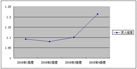 (二)勞動力市場供需平衡,就業(yè)結(jié)構(gòu)不斷優(yōu)化。2016年第四季度,全省各類用人單位共提供空缺崗位44.14萬個,求職總?cè)藬?shù)為36.37萬,求人倍率為1.21,其余三個季度的求人倍率也均大于1(如下圖)??偟膩砜矗鲜∪肆Y源市場供求比例保持動態(tài)平衡,就業(yè)崗位供大于求。隨著湖南省產(chǎn)業(yè)結(jié)構(gòu)調(diào)整不斷推進,服務(wù)業(yè)快速發(fā)展,省內(nèi)就業(yè)結(jié)構(gòu)進一步優(yōu)化。從產(chǎn)業(yè)用工需求看,第三產(chǎn)業(yè)用工需求占用工總需求的58.0%,比重較上年提高1.7個百分點。另外,作為制造業(yè)大省,近年來,湖南對接中國制造2025不斷提速,向著制造業(yè)強省的目標奮力邁進。2016年,全省制造業(yè)用工需求仍居各行業(yè)之首,占用工總需求比重的31.0%。