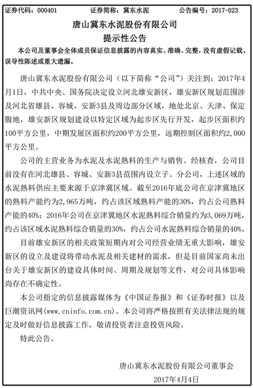 冀東水泥回應(yīng):公司在京津冀區(qū)域水泥銷售價格上漲,對公司利潤影響暫無法做定量判斷,但有一定正向影響;因目前國家尚未出臺關(guān)于雄安新區(qū)的建設(shè)具體時間、周期及規(guī)劃等文件,對公司具體影響尚存在不確定性;公司目前沒有在河北雄縣、容城、安新3縣范圍內(nèi)設(shè)立子、分公司。