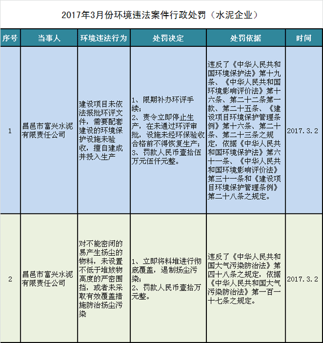 據(jù)處罰信息顯示,昌邑市富興水泥有限責任公司因“建設(shè)項目未依法報批環(huán)評文件,需要配套建設(shè)的環(huán)境保護設(shè)施未驗收,擅自建成并投入生產(chǎn)”和“對不能密閉的易產(chǎn)生揚塵的物料,未設(shè)置不低于堆放物高度的嚴密圍擋,或者未采取有效覆蓋措施防治揚塵污染”等環(huán)境違法行為分別被處以“限期補辦環(huán)評手續(xù);責令立即停止生產(chǎn),在未通過環(huán)評審批,設(shè)施未經(jīng)環(huán)保驗收合格前不得恢復生產(chǎn);罰款人民幣壹拾伍萬元伍仟元整”和“立即將料堆進行徹底覆蓋,遏制揚塵污染;罰款人民幣壹拾萬元整”處罰。