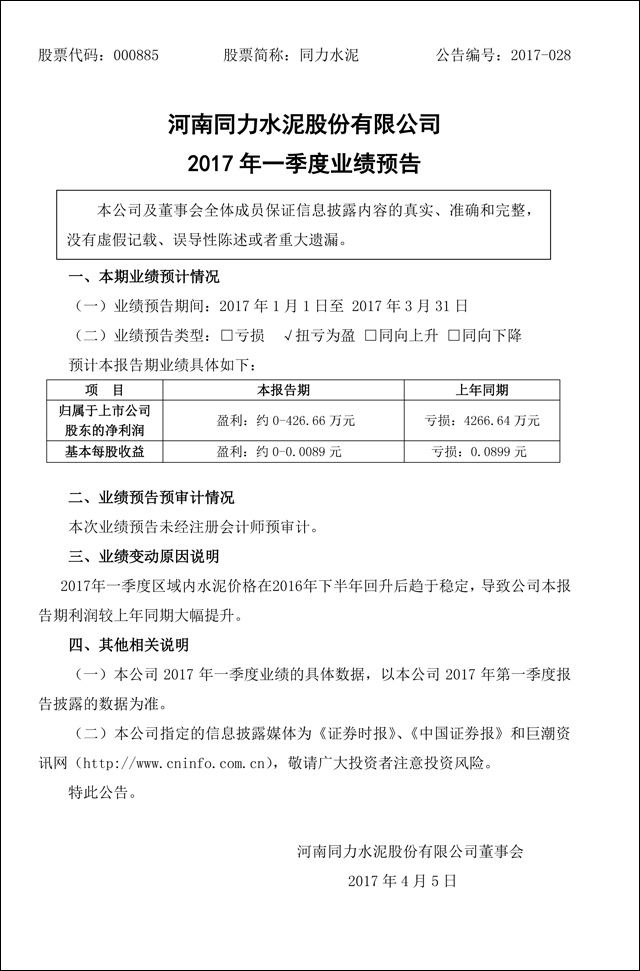 同力水泥(000885)4月5日晚間公告,公司預(yù)計(jì)2017年一季度實(shí)現(xiàn)扭虧,盈利不超過(guò)426.66萬(wàn)元,上年同期為虧損4266.64萬(wàn)元;扭虧原因?yàn)楫?dāng)季區(qū)域內(nèi)水泥價(jià)格在2016年下半年回升后趨于穩(wěn)定。同力水泥今日漲停,報(bào)收24.09元/股。