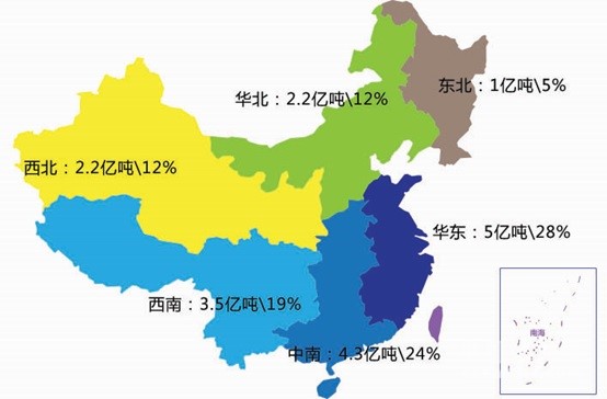 2016年底,全國新型干法熟料設計總產能達18.2億噸(310天計算),北方、南方新型干法熟料產能占全國的比重分別為29.6%(5.4億噸)和70.4%(12.8億噸),其中華東、中南新型干法熟料產能占全國的比重分別為27.6%(5億噸)和23.9%(4.3億噸),西南地區(qū)占19%(3.5億噸),西北、華北分別占12%(2.2億噸),東北占5%(1億噸)。