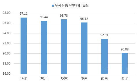 分區(qū)域來看,華北、東北、華東、中南四大區(qū)域窯外分解窯熟料產量占比均超過96%,西北及西南地區(qū)這比比例較其他區(qū)域則略低,分別為93%和90%,西北地區(qū)非窯外分解窯熟料產量的比重接近10%。