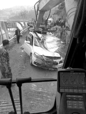 救援人員趕到現(xiàn)場后,破拆轎車后發(fā)現(xiàn)轎車變形嚴重,無法實施救援,于是有關部門又調來一輛吊車,將罐車吊起。
