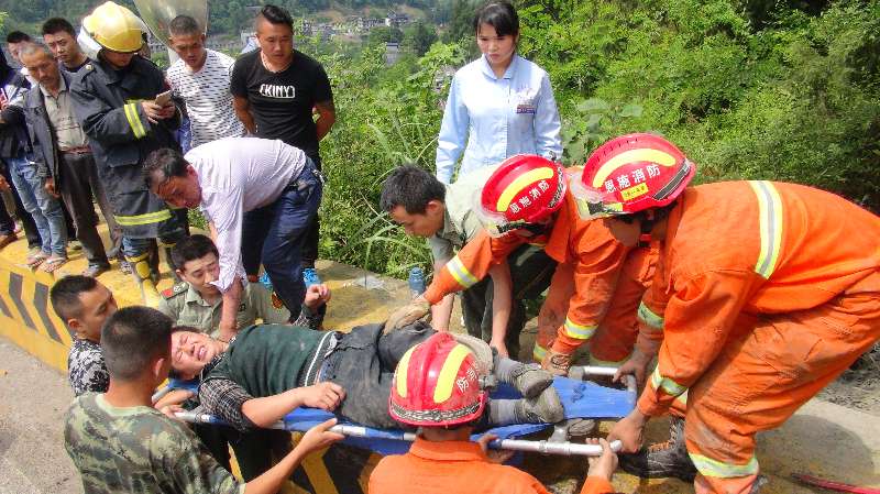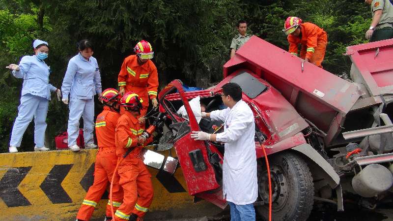 13時30分,吊車從城區(qū)趕到現(xiàn)場開展起吊作業(yè),為了保證起吊時平穩(wěn)可靠,不對被困人員造成二次傷害,救援官兵負責保護。“起吊!”,隨著現(xiàn)場指揮員的一聲令下,貨車車頂被成功吊起。隨后救援官兵利用液壓擴張器,鉆入副駕駛室一側(cè),在車內(nèi)的夾縫中實施擴張救援。15分鐘后,被困人員的被卡部位開始松動,救援人員立即將被困人員從車內(nèi)一個一個抬出,并抬上擔架送上救護車緊急送往醫(yī)院進行救治。