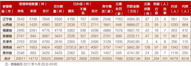 截至2017年5月28日20:00,共計(jì)受理舉報(bào)35523個(gè)(其中,來(lái)電舉報(bào)20811個(gè),來(lái)信舉報(bào)14712個(gè));經(jīng)梳理分析并合并重復(fù)舉報(bào),累計(jì)向被督察地方交辦有效舉報(bào)28966件。地方已辦結(jié)23599件,責(zé)令整改20359家,立案處罰7086家,共計(jì)罰款33587.86萬(wàn)元;立案?jìng)刹?54件,行政和刑事拘留355人,約談6079人,問(wèn)責(zé)4018人(具體情況詳見(jiàn)附表)。