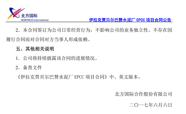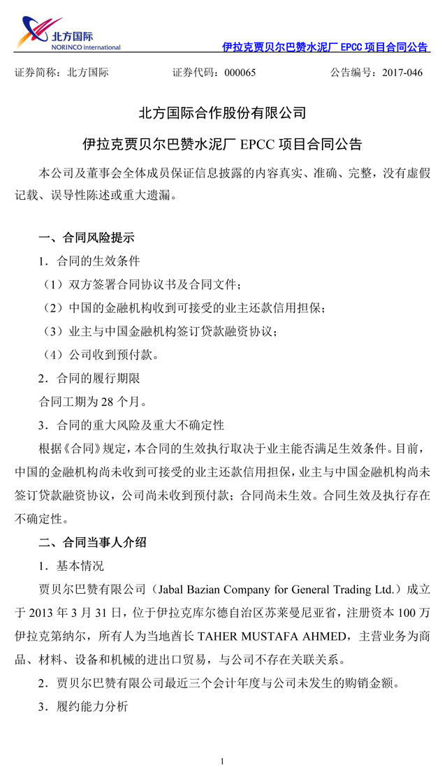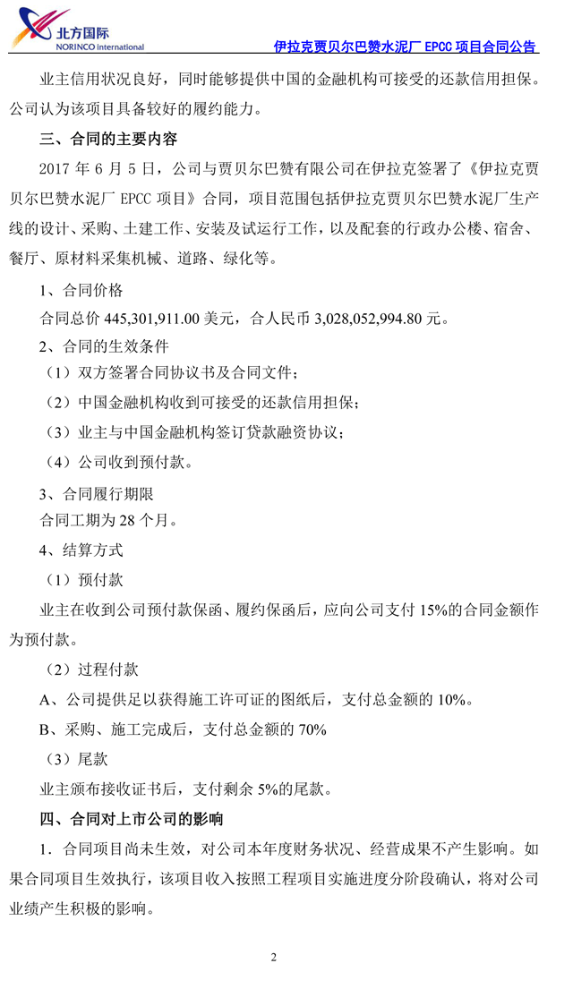 2017年6月5日,北方國(guó)際與賈貝爾巴贊有限公司在伊拉克簽署合同,項(xiàng)目范圍包括伊拉克賈貝爾巴贊水泥廠生產(chǎn)線的設(shè)計(jì)、采購(gòu)、土建工作、安裝及試運(yùn)行工作,以及配套的行政辦公樓、宿舍、餐廳、原材料采集機(jī)械、道路、綠化等。合同總價(jià)445,301,911.00美元,合人民幣3,028,052,994.80元。