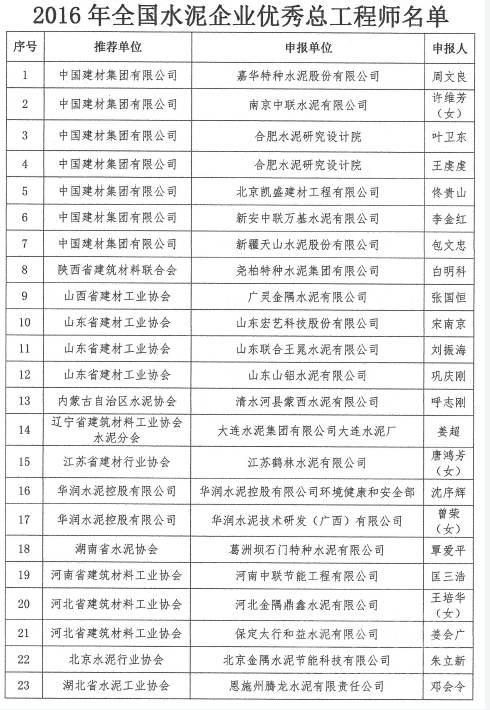 現(xiàn)決定授予周文良等23人“2016年全國(guó)水泥企業(yè)優(yōu)秀總工程師”稱號(hào)。希望全國(guó)水泥企業(yè)的生產(chǎn)和技術(shù)負(fù)責(zé)人向獲得表彰的優(yōu)秀總工學(xué)習(xí),在企業(yè)的技術(shù)進(jìn)步、技術(shù)創(chuàng)新和節(jié)能減排等方面做出更大貢獻(xiàn)。