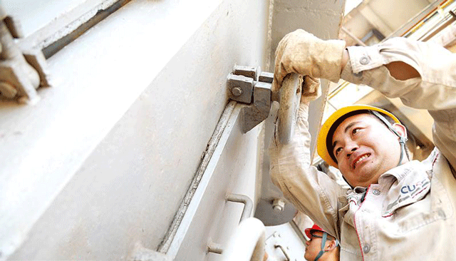 昨日,在位于新安縣產(chǎn)業(yè)集聚區(qū)的新安中聯(lián)水泥有限公司廠區(qū)內(nèi),工人們正對(duì)完成提標(biāo)改造的環(huán)保設(shè)備進(jìn)行復(fù)檢。