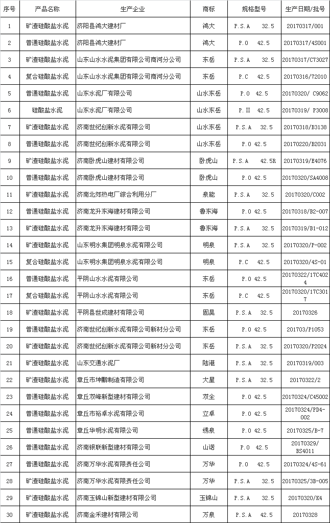 2017年3-5月,濟(jì)南市質(zhì)量技術(shù)監(jiān)督局組織開(kāi)展了通用硅酸鹽水泥產(chǎn)品質(zhì)量市監(jiān)督抽查。本次共抽查了全市20家企業(yè)生產(chǎn)的30批次產(chǎn)品。本次抽查的產(chǎn)品全部合格。