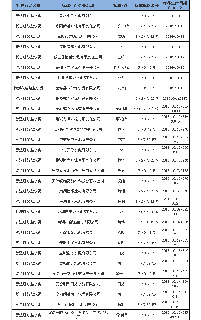 安徽省質(zhì)監(jiān)局官網(wǎng)公布的2016年水泥產(chǎn)品省級 監(jiān)督抽查結(jié)果,在全省7個地市(合肥、蕪湖、宣城、滁州、阜陽、黃山、亳州)的水泥產(chǎn)品生產(chǎn)領(lǐng)域內(nèi)共抽取51組水泥樣品,51組水泥產(chǎn)品綜合判定結(jié)論均為合格,抽檢合格率為100%。