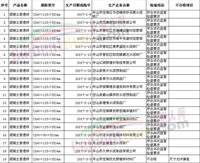 月14日,舟山市市場監(jiān)督管理局官網(wǎng)公布2017年二季度舟山市混凝土普通磚產(chǎn)品市級監(jiān)督抽查結果,該局共抽查了19家企業(yè)的19批次混凝土普通磚產(chǎn)品,合格18批次,不合格1批次,批次不合格率為5.3%。