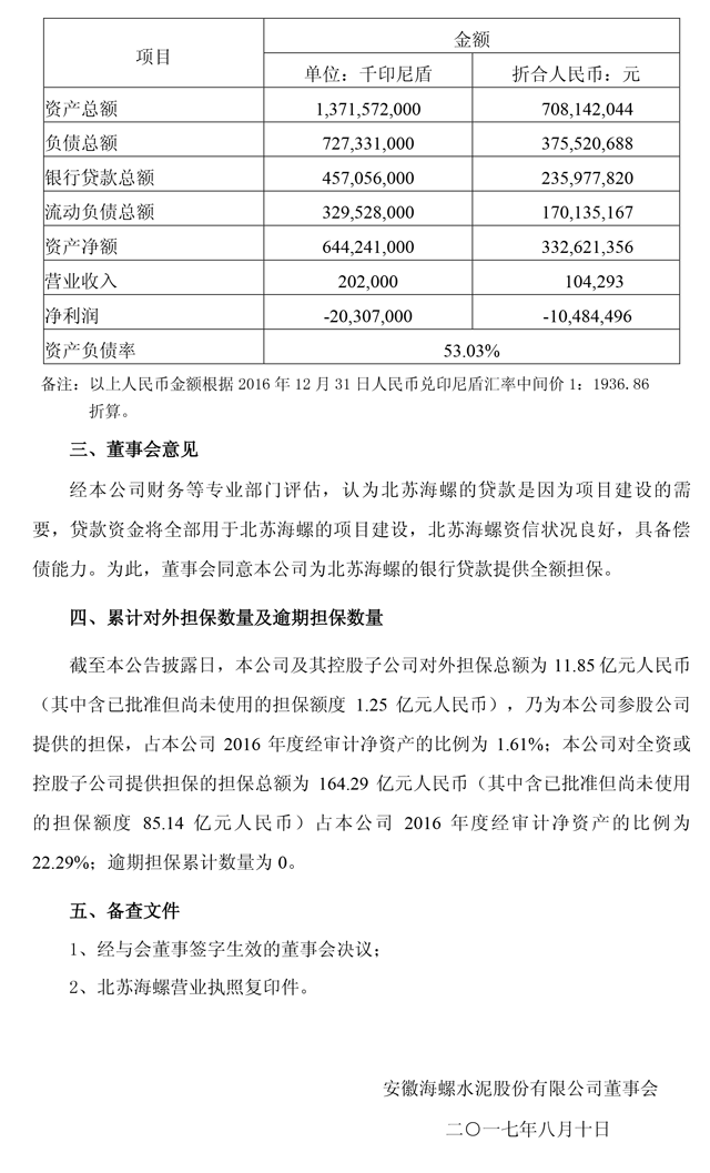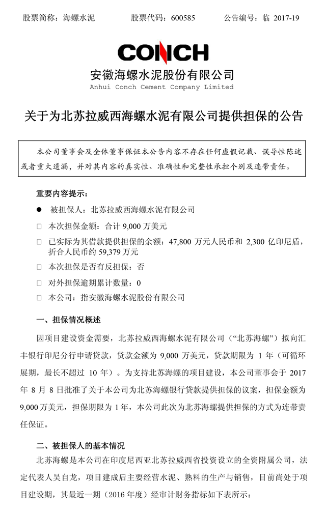 為支持北蘇海螺的項(xiàng)目建設(shè),公司董事會(huì)于2017年8月8日批準(zhǔn)了關(guān)于公司為北蘇海螺銀行貸款提供擔(dān)保的議案,擔(dān)保金額為9000萬(wàn)美元,擔(dān)保期限為1年,公司此次為北蘇海螺提供擔(dān)保的方式為連帶責(zé)任保證。