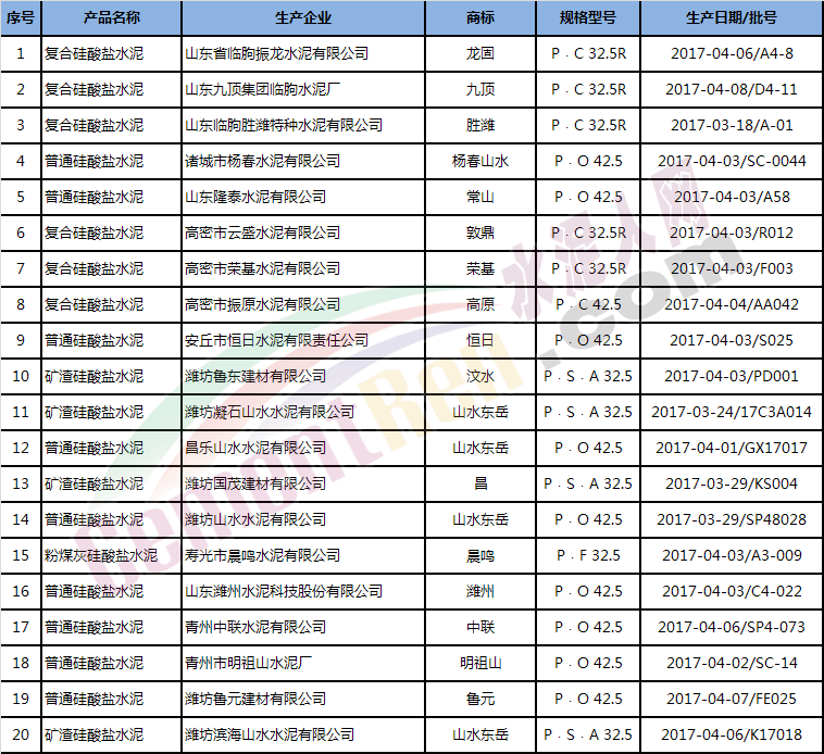 濰坊市2017年第2批市級(jí)監(jiān)督抽查水泥產(chǎn)品質(zhì)量結(jié)果匯總表