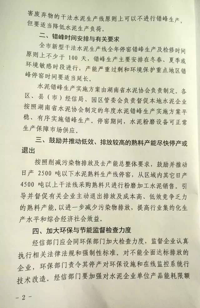 1、根據(jù)湖南全省水泥行業(yè)的過剩程度、污染物防治排放要求與各企業(yè)熟料產(chǎn)能能耗、效率等實(shí)際情況,全省新型干法熟料生產(chǎn)線全年按70%的運(yùn)轉(zhuǎn)時間計(jì)算,折合每條生產(chǎn)線停窯時間為110天,其中一季度40天(除衡陽、永州停窯35天外),二季度25天,三季度25天,四季度20天。
