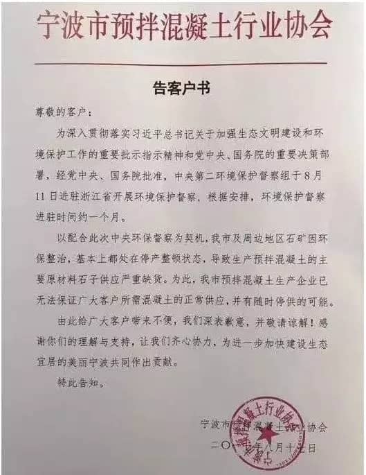 而就在環(huán)保督察組進(jìn)駐一周的時(shí)間,寧波市預(yù)拌混凝土行業(yè)協(xié)會(huì)發(fā)布《發(fā)客戶書(shū)》,稱(chēng)為配合環(huán)保督查為契機(jī),寧波市及周邊地區(qū)石礦因環(huán)保整治,基本都處于停產(chǎn)整頓狀態(tài),導(dǎo)致生產(chǎn)預(yù)拌混凝土的主要原材料石子供應(yīng)嚴(yán)重缺貨。為此,寧波市預(yù)拌混凝土生產(chǎn)企業(yè)無(wú)法保證混凝土的正常供應(yīng),并有隨時(shí)停供的可能!