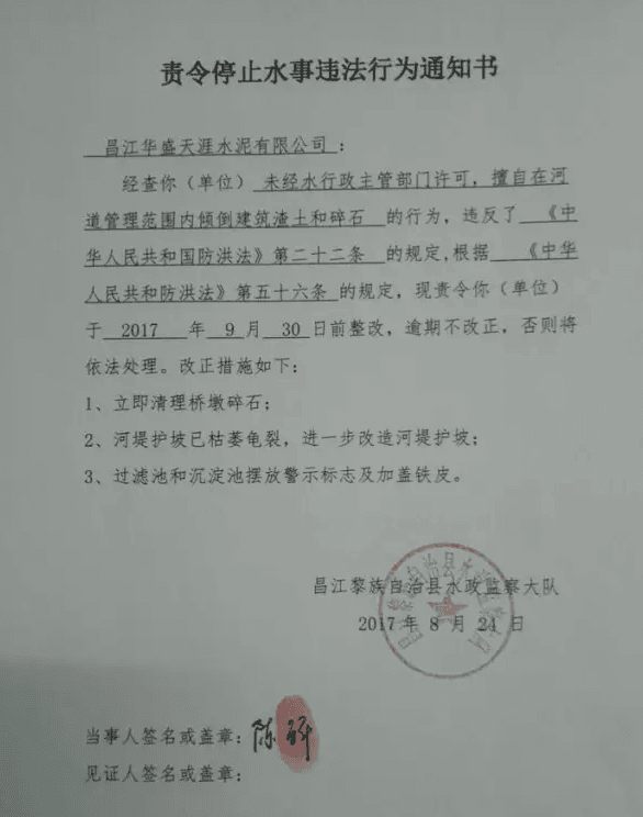聯(lián)合執(zhí)法部門嚴(yán)肅責(zé)令華盛水泥廠接受二次《責(zé)令停止水事違法行為通知書》,要求華盛水泥廠在2017年9月30日前必須整改以下三點(diǎn)問(wèn)題:一、立即清理橋墩碎石;二、沉淀池及過(guò)濾池須加蓋鐵皮及擺放警示標(biāo)志;三、河堤護(hù)坡已枯萎龜裂,為防止汛期雨水將泥塊沖刷入河,必須限期改造成菱形網(wǎng)格植被護(hù)坡。若限期整改效果未達(dá)到《責(zé)令停止水事違法行為通知書》所要求標(biāo)準(zhǔn),則依法接受行政處罰。