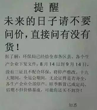 重要提示:環(huán)保局已經(jīng)給全市各縣各個(gè)生產(chǎn)企業(yè)下發(fā),8月14日到9月14日,沒有三證的配合環(huán)保,停產(chǎn)整改。十九大期間,全運(yùn)會(huì)期間,無(wú)論證件是否齊全,各生產(chǎn)企業(yè)全部停產(chǎn),旺季斷貨已成定局!
