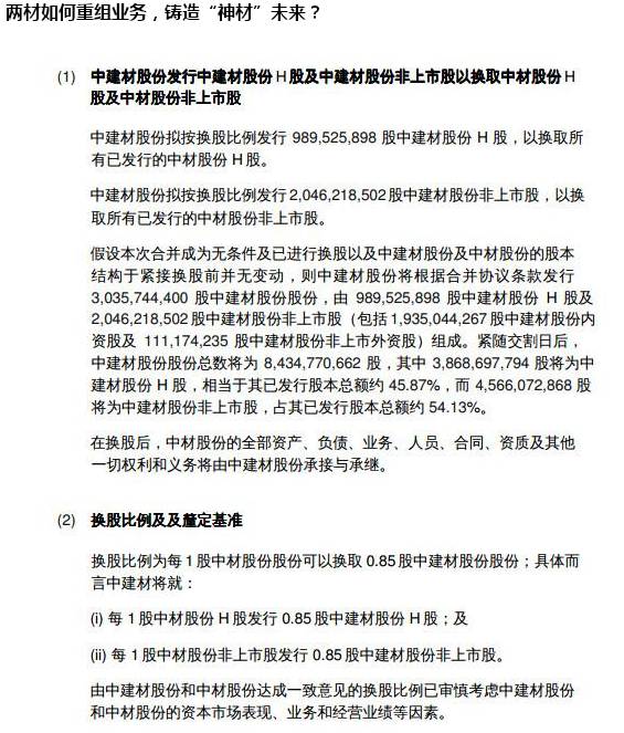 中建材股份和中材股份是中國(guó)一流、全球重要的建材企業(yè),本次合并將實(shí)現(xiàn)強(qiáng)強(qiáng)聯(lián)合,優(yōu)勢(shì)互補(bǔ),合并后中建材股份有望在產(chǎn)業(yè)布局、業(yè)務(wù)規(guī)模、產(chǎn)品和服務(wù)等方面擁有全面、綜合的競(jìng)爭(zhēng)優(yōu)勢(shì),從而進(jìn)一步提升在全球建材行業(yè)的競(jìng)爭(zhēng)力。預(yù)期合并后中建材股份將是全球水泥產(chǎn)能排名第一的企業(yè);并在商品混凝土生產(chǎn)、水泥工程服務(wù)、石膏板生產(chǎn)、玻纖制造(考慮中建材股份聯(lián)營(yíng)公司中國(guó)巨石)、風(fēng)機(jī)葉片生產(chǎn)等多個(gè)領(lǐng)域擁有世界領(lǐng)先地位。
