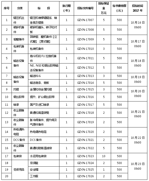 貴州西南水泥有限公司是西南水泥有限公司下屬子公司,于2012年3月21日成立。貴州西南水擬定于2017年10月中旬對下屬26家成員企業(yè)2018年度輔材備件進行集中招標,通過邀請招標選擇資質(zhì)合格、保供能力強、質(zhì)量及技術(shù)服務(wù)均受控的供貨單位?,F(xiàn)將相關(guān)招標采購信息發(fā)布如下: