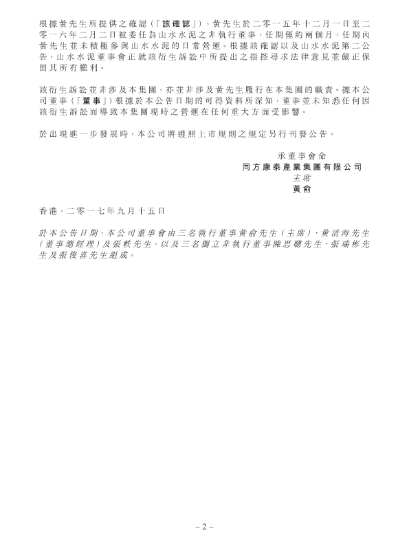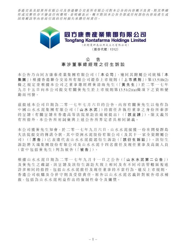 【水泥人網(wǎng)】同方康泰(01312)發(fā)布公告,該公司獲董事總經(jīng)理黃清海知會(huì),于2017年9月6日,山水水泥接獲一份在開曼群島大法院提交的傳訊令狀,其中亞洲水泥股份有限公司(原告)已表達(dá)代表山水水泥提起衍生訴訟。