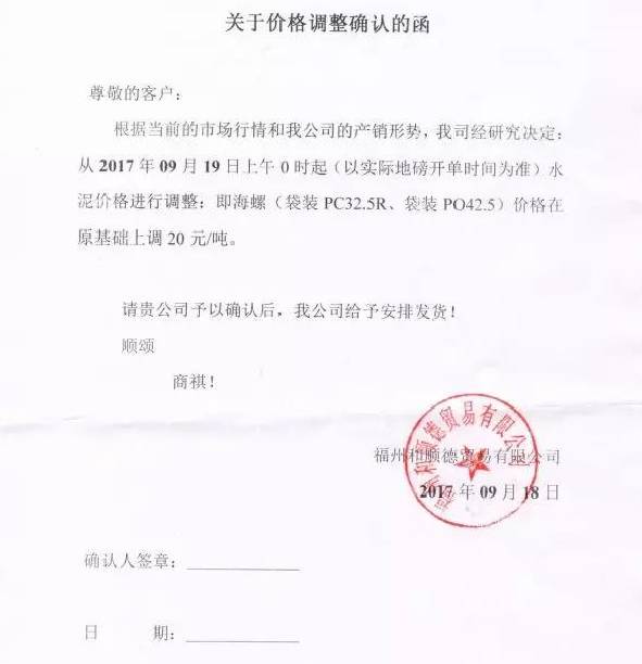 根據(jù)目前市場行情,經(jīng)公司研究決定 ,自2017年9月22日零時(shí)起,我司發(fā)往福建省內(nèi)各區(qū)域的袋、散水泥的出廠價(jià)在原來的價(jià)格基礎(chǔ)上上調(diào)20元/噸。熟料同步上調(diào)20元/噸。