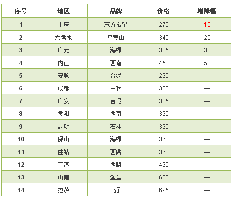 西南地區(qū),僅四川及重慶局部地區(qū)提價(jià)。因西南地區(qū)分布較廣,多為小區(qū)域市場。故價(jià)格差相對較大。從重慶地區(qū)的275元/噸到西藏拉薩的695元/噸,差價(jià)約420元/噸。