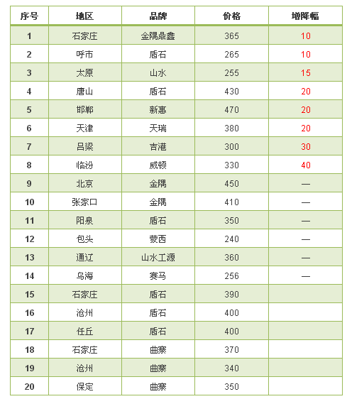 本期漲價(jià)的地區(qū)或受區(qū)域原材料及近期環(huán)保加嚴(yán)的影響。華北,華東區(qū)域受京津冀地區(qū)錯(cuò)峰限產(chǎn),水泥及熟料庫位較低的影響。