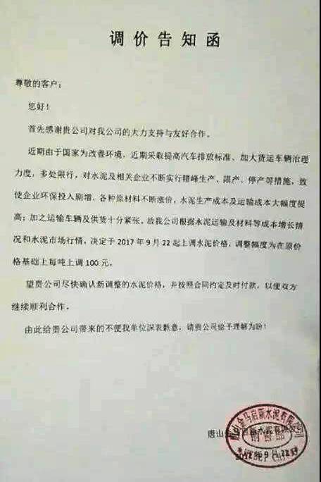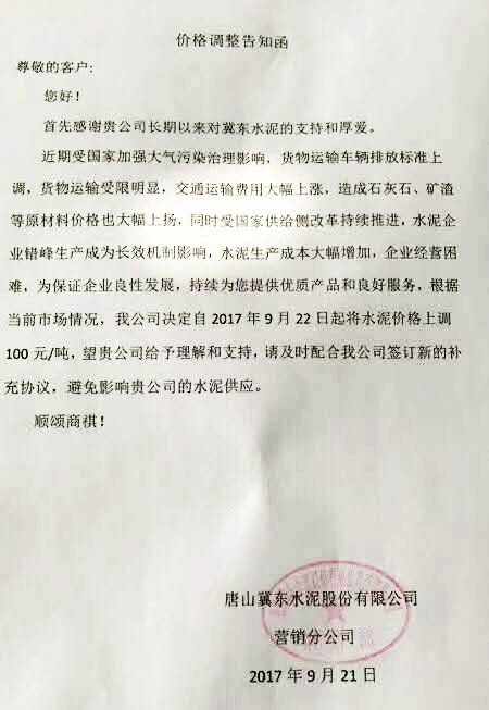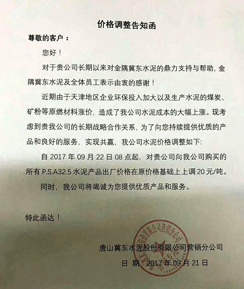 唐山冀東水泥股份有限公司提價(jià)通知