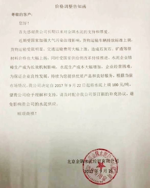 北京金隅水泥提價(jià)通知