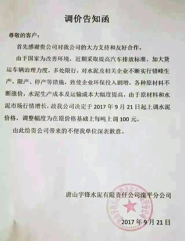 唐山金馬啟新水泥提價(jià)通知