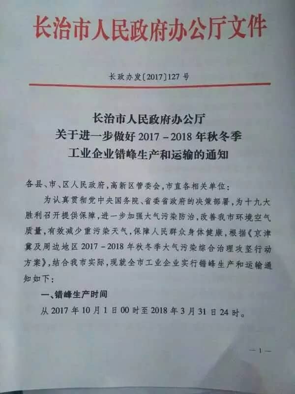 近日,山西省長治市發(fā)布《關(guān)于進(jìn)一步做好2017-2018秋冬季工業(yè)企業(yè)錯(cuò)峰生產(chǎn)和運(yùn)輸?shù)耐ㄖ?,該文件明確規(guī)定,自2017年10月1日00時(shí)起至2018年3月31日24時(shí),所有建材行業(yè)全部停產(chǎn),包括水泥(含粉磨站)、磚瓦窯、陶瓷、石膏板、石砼、石料廠、石膏廠、礦渣微粉(高細(xì)粉)等。
