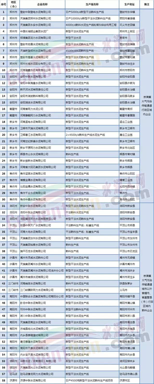 (1)鄭州、開(kāi)封、安陽(yáng)市、鶴壁、新鄉(xiāng)、焦作、濮陽(yáng)、鞏義、蘭考、滑縣、長(zhǎng)垣等京津冀大氣污染傳輸通道行政區(qū)域內(nèi)的43家水泥2017年11月15日至2018年3月15日,全部停產(chǎn)。