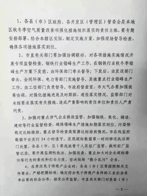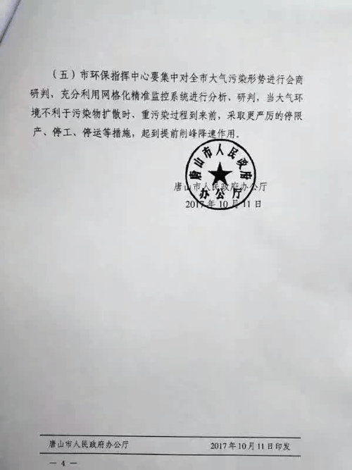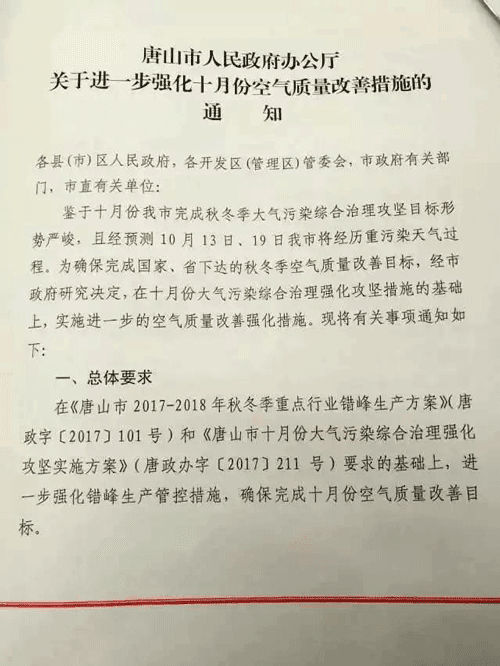 通知稱之所以提前啟動(dòng)錯(cuò)峰生產(chǎn)是因?yàn)槭路萏粕绞型瓿汕锒敬髿馕廴揪C合治理攻堅(jiān)目標(biāo)形勢嚴(yán)峻,且經(jīng)預(yù)測10月13日、19日唐山市將經(jīng)歷重污染天氣過程。為確保完成國家、省下達(dá)的秋冬季空氣質(zhì)量改善目標(biāo),經(jīng)唐山市政府研究決定,在十月份大氣污染綜合治理強(qiáng)化攻堅(jiān)措施的基礎(chǔ)上,實(shí)施進(jìn)一步的空氣質(zhì)量改善強(qiáng)化措施。