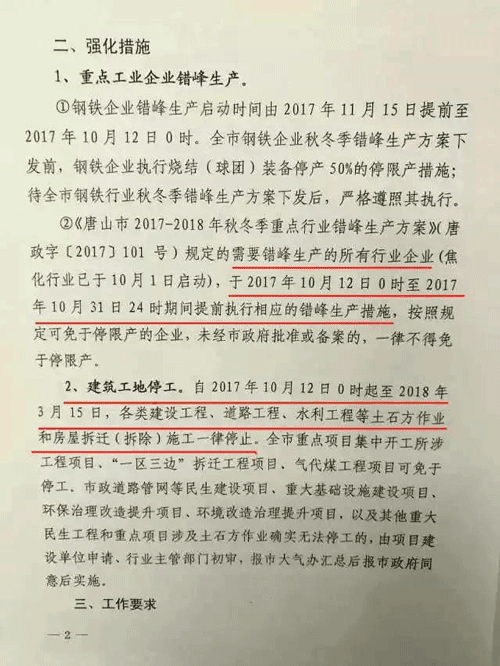 通知要求《唐山市2017-2018年秋冬季重點(diǎn)行業(yè)錯(cuò)峰生產(chǎn)方案》(唐政字[2017]101號(hào))規(guī)定的需要錯(cuò)峰生產(chǎn)的所有行業(yè)企業(yè),于2017年10月12日0時(shí)至2017年10月31日24時(shí)期間提前執(zhí)行相應(yīng)的錯(cuò)峰生產(chǎn)措施,按照規(guī)定可免于停限產(chǎn)的企業(yè),未經(jīng)市政府批準(zhǔn)或備案的,一律不得免于停限產(chǎn)。