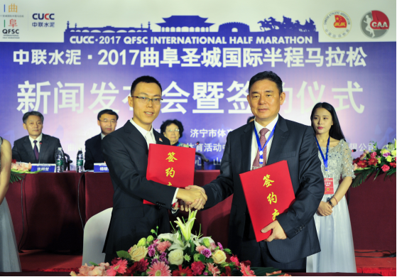 隨后,北京初美體育文化發(fā)展有限公司總經理吳宇熙與中國聯(lián)合水泥集團有限公司總經理、黨委副書記孫建成簽約。中國聯(lián)合水泥集團有限公司正式成為2017曲阜圣城國際半程馬拉松的獨家冠名商。濟寧市體育局副局長邵波為冠名贊助商中國聯(lián)合水泥集團有限公司授牌。賽事獨家冠名商中國聯(lián)合水泥集團有限公司總經理、黨委副書記孫建成致辭。