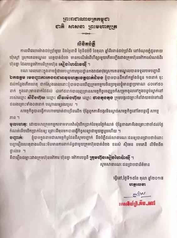 以下為馬德望省蒙多縣憲兵司令部出具的聲明: